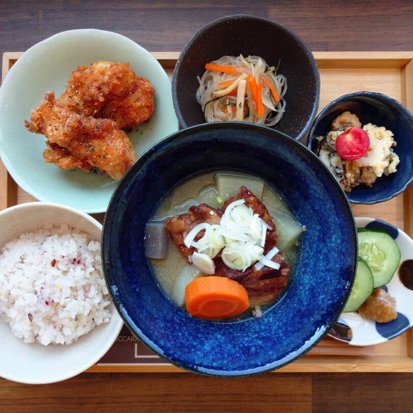 日本海が一望できるカフェスポットでランチは、ごはん、豚汁、からあげ、小鉢が3皿という構成になっており、それにケーキとドリンクもついているボリューム満点な内容となっています。