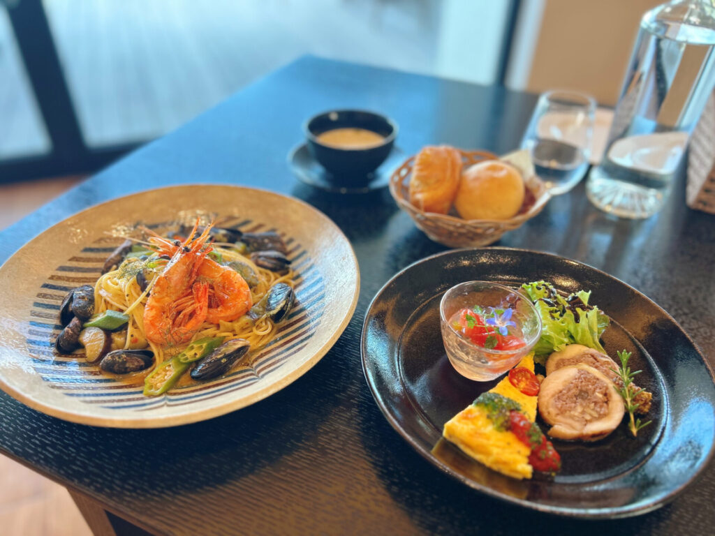 写真はアルマーレランチです。岩美町の新鮮な魚介類や野菜を使用したこだわりのイタリアン料理。東浜の美しい海を眺めながら食事できます。